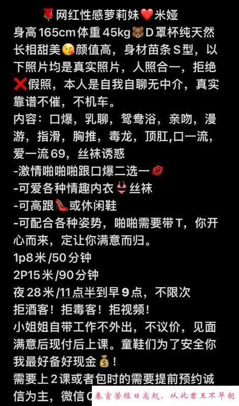 【特别注意】:凡是需要支付定金或路费的都是诈骗,再次提醒各位,一定不要先给钱!建议服务完后再给钱,或者谈好先给部分完事给剩下的。遇到还没服务就先给钱的,要千万小心被跑路和服务体验差,无数会员反馈谈好过夜却中途找借口跑路的情况!见面感觉不对劲就宁愿不玩,不然花了钱玩不开心得不偿失!